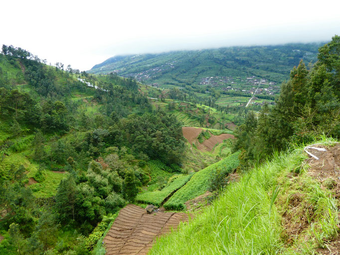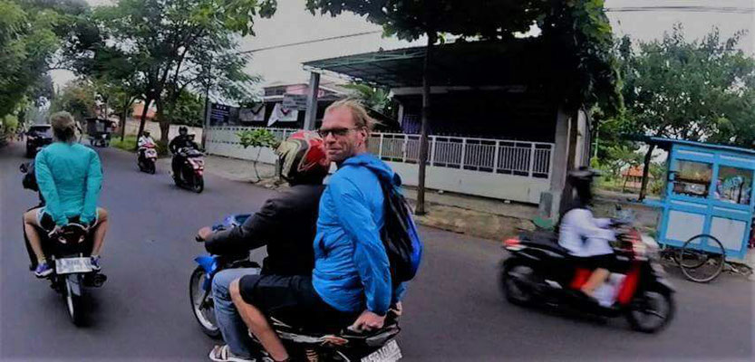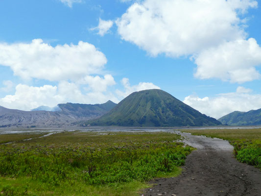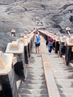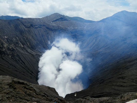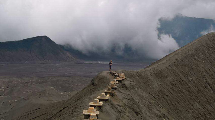 Am nächsten Tag steht der Mount Bromo auf dem Plan. Mit dem Minibus können wir ziemlich nahe an den Vulkan fahren. Die letzten Meter zum Kraterrand werden durch eine Treppe geebnet, so dass der Aufstieg gut machbar ist. Von oben hat man einen schönen Ausblick in den rauchenden Krater. Der für den Rückweg versprochene Minibus kommt leider nicht, so dass wir auf Motorradtaxis umsteigen müssen. Die bieten dafür aber mehr Nervenkitzel.