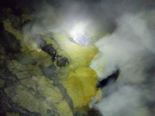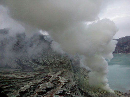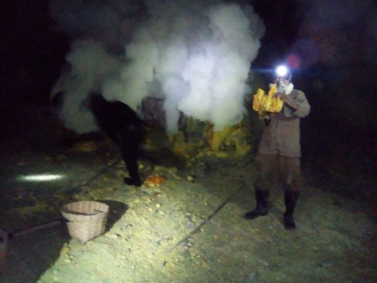Da der Ijen für sein blaues Feuer bekannt ist, das man nur nachts sieht, müssen wir schon um ein Uhr starten. Zusammen mit einem Guide und zwei Franzosen fahren wir ca. eine Stunde zum Fuß des Ijen. Zum Glück sind die Franzosen auch gut zu Fuß, aber leider nicht unser Guide, der uns kaum hinter her kommt. Nach ca. einer Stunde erreichen wir den Gipfel und wir bekommen von unserem Guide (der uns wieder eingeholt hat) Gasmasken ausgehändigt. Zum Anfang scheinen diese nicht notwendig, doch dann geht es hinab in den Krater, wo man teilweise vor Schwefelgasen den Weg nicht sehen kann. Weiter unten sehen wir aber schon die blauen Feuer durch den Dunst scheinen. Der Abstieg kommt uns vor wie der Gang in den Höllenschlund. Unten angekommen sieht man Arbeiter Schwefel aus dem Stein brechen. Da die Arbeiter stetig Feuer entfachen um den Schwefel abzubauen entstehen die blauen Flammen. Durch die Mischung aus hart arbeitenden Minenarbeitern und zuschauenden Touristen, deren Handys und Fotoapparate aufleuchten, entsteht ein surreales Bild. Für die, die wir dort unten kaum eine Stunde aushalten können, ist es unvorstellbar, dort arbeiten zu müssen. Nach einer Stunde im Krater steigen wir wieder auf. Dabei überholen uns Arbeiter, die mit Schwefel befüllte Körbe, die bis zu 90 kg wiegen, nach oben tragen. Die Ausbeute daraus beträgt 1.000 Rupees pro kg (weniger als 1 Euro). Oben angekommen, verdeckt starker Schwefeldampf den erhofften Sonnenaufgang. Wir genießen noch die Aussicht auf den Kratersee und steigen ab. Direkt im Anschluss fahren wir weiter Richtung Probolinggo.