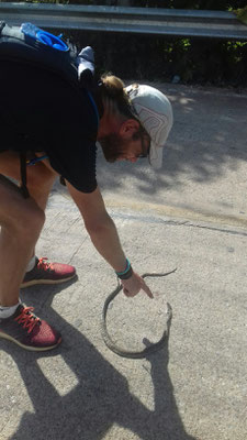 Neben den vielen schönen Eindrücken unterwegs sorgt die tote wie die lebende Tierwelt immer wieder für Schreckmomente. Manchmal sehen wir Schlangen und wissen von Weitem nicht ob sie noch leben. Die meisten weisen aber zum Glück stellenweise eine „Continental- Maserung“ auf und sind daher nicht mehr allzu gefährlich.