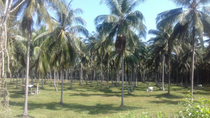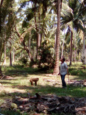 Unterwegs sehen wir eine interessante Arbeitsteilung. Dressierte Affen klettern auf Kokos Palmen und werfen ihren Pflegern die geernteten Kokosnüsse zu.