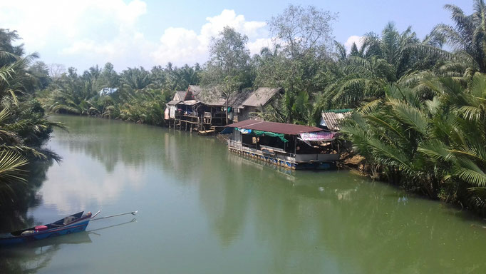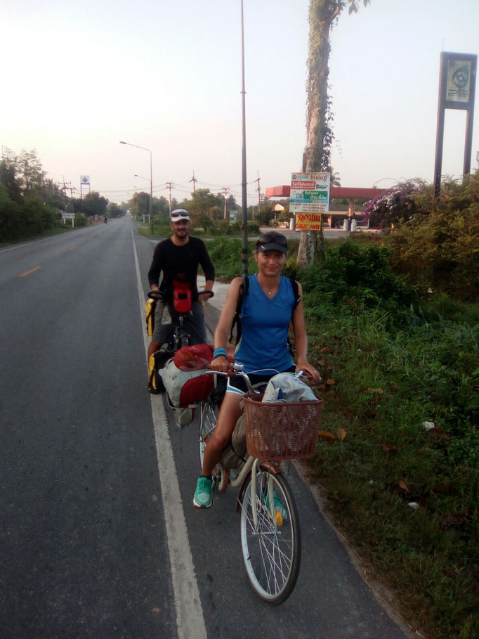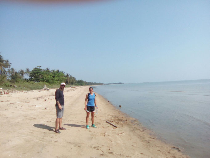 In Sura Thani treffen wir uns wieder mit Jason, der uns zwei Tage lang begleitet. Leider können wir ihn nur nicht davon überzeugen auch mal zu laufen. Zum größten Teil führt uns die Strecke über ruhige Wege durch dichtbewachsene Naturwälder vorbei an Reisfeldern, Sumpflandschaften, Flüssen und Fischerdörfern. Immer wieder können wir auch Pausen am Strand einlegen.