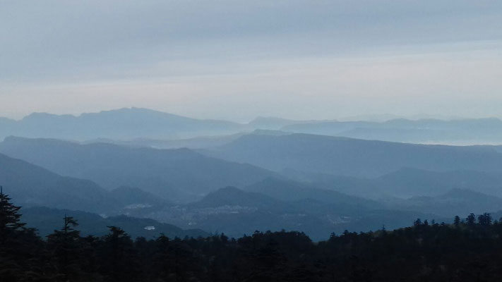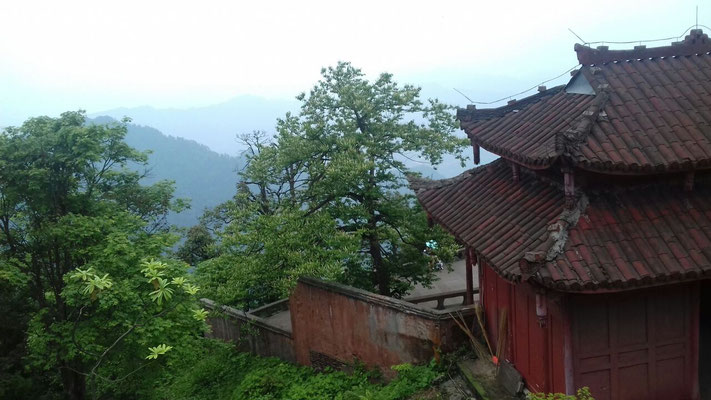 Unser nächstes Ziel ist der Emei Shan, einer der fünf heiligsten buddhistischen Berge Chinas. Auf seiner gesamten Höhe von 3099 Metern erstrecken sich vom Boden bis zur Spitze endlose Treppenstufen. Der Aufstieg ist ein Kontrast zu den einsamen Wanderungen der letzten Tage. Teilweise sehen wir lange Schlangen von Touristen, die wie wir an Essensständen und Souvenirläden vorbei gehen. Kurz vor dem Gipfel übernachten wir in einem Kloster, das einen großen Schlafsaal für die Wanderer bereithält. Nach einer kurzen, lauten, hellen, unruhigen Nacht steigen wir im Dauerregen die letzten Treppen zum Gipfel hoch.